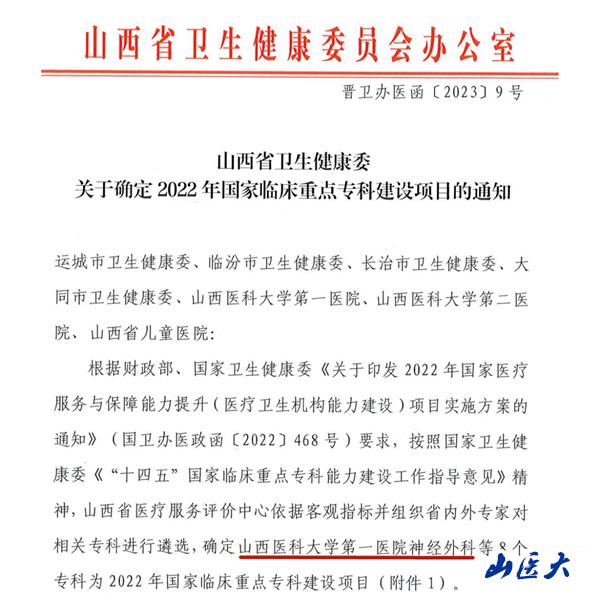 根据国家卫生健康委《“十四五”国家临床专科能力建设规划》和《“十四五”国家临床重点专科能力建设工作指导意见》,山西省卫生健康委遴选8个临床专科为2022年国家临床重点专科建设项目,我校第一医院神经外科成为我省唯一入选国家临床重点专科的神经外科。