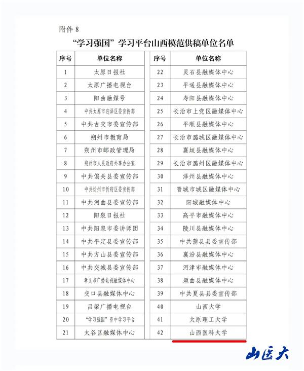 自“学习强国”平台上线后,我校积极向“学习强国”山西学习平台投稿,学校强化组织领导、加强内容策划、优化主题报道、指定专人负责,不断创新供稿形式,推出了图文、短视频、科普作品等一系列作品来全方位、多层次地讲述山医的发展故事。我校党员干部和师生充分利用平台的权威性、丰富性和便捷性特点,把平台作为加强思想理论武装、开展日常学习的重要渠道和载体,不断提升自身的政治意识、理论水平、实践能力,在全校营造了“勤学、乐学、好学”的学习氛围,在持续推动学习新思想走深走实走心上取得明显成效。