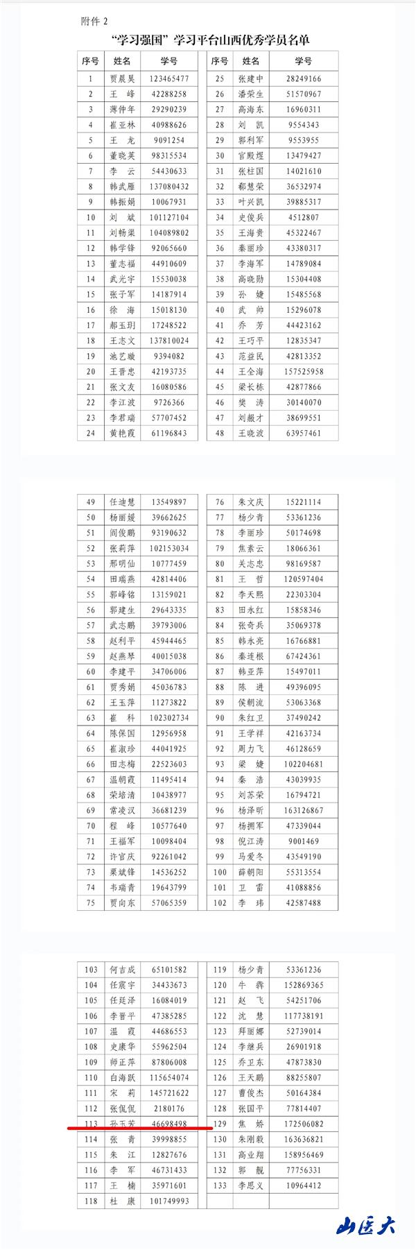 近日,“学习强国”山西学习平台公布了“2022年度‘学习强国’山西学习之星、强国志愿之星、优秀工作者、模范组织”评选结果,我校获评“学习强国”学习平台山西模范供稿单位,我校国际合作与交流处教师孙玉芳获评“学习强国”学习平台山西优秀学员称号。