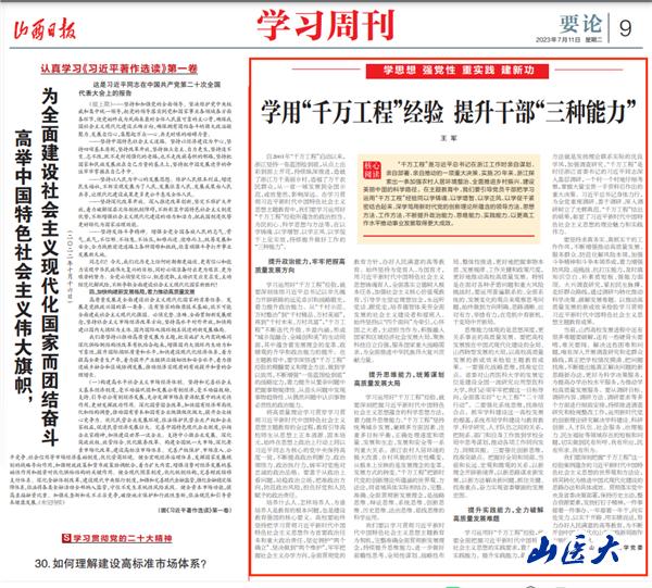 7月11日,《山西日报》第9版“学习周刊·要论”版刊发我校党委书记王军同志的理论文章《学用“千万工程”经验 提升干部“三种能力”》。文章强调,在学习贯彻习近平新时代中国特色社会主义思想主题教育中,要把学习运用“千万工程”经验同以学铸魂、以学增智、以学正风、以学促干紧密结合起来,不断“提升政治能力,牢牢把握高质量发展方向”“提升思维能力,统筹谋划高质量发展大局”“提升实践能力,全力破解高质量发展难题”,以更高的工作水平推动事业发展取得更大成效。