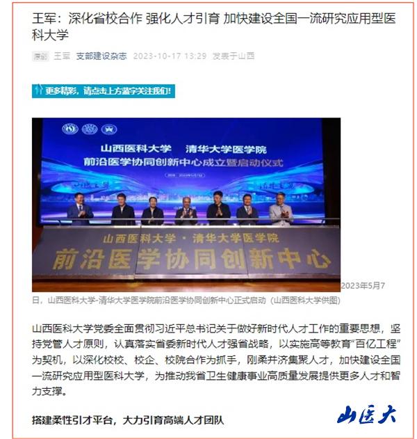 10月17日,山西省重点党建旬刊《支部建设》杂志“主题策划”栏目刊发我校党委书记王军署名文章《深化省校合作 强化人才引育 加快建设全国一流研究应用型医科大学》。文章从“搭建柔性引才平台,大力引育高端人才团队”“服务国家重大战略,培养高水平公共卫生人才”“深化产教研用融合,更好服务山西转型发展”“完善激励保障机制,全面优化人才发展生态”四个部分,深度阐述了我校党委全面贯彻习近平总书记关于做好新时代人才工作的重要思想,坚持党管人才原则,认真落实省委新时代人才强省战略,以实施高等教育百亿工程为契机,以深化校校、校企、校院合作为抓手,刚柔并济集聚人才,加快建设全国一流研究应用型医科大学,为推动我省卫生健康事业高质量发展提供更多的人才和智力支撑。