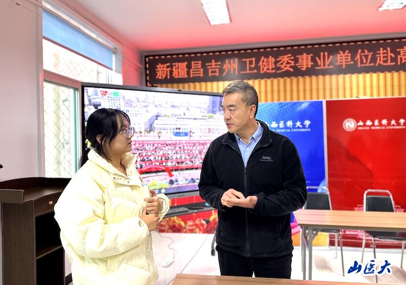 王宏伟与卫健委及各医院领导热情交流,他指出,2023年3月昌吉州有关领导就来到学校开展“千名硕士进昌吉”专项活动,此次昌吉州各位领导再次选择来到山医,三家医院共提供了150余个就业岗位,他向各位领导表示了热烈欢迎和诚挚谢意,并鼓励参会的2024届毕业生特别是新疆籍毕业生积极求职应聘,希望与昌吉州卫健委及各医疗事业单位加强联系并开展全方位的合作。昌吉州人民医院副院长刘书鹏、昌吉州中医医院副院长魏学民、新疆医科大学附属第一医院昌吉分院副院长张媛等院领导详细介绍了此次招聘各医院的招聘情况,表示愿与学校建立长期合作关系,扎实推进引才宣介工作,吸引更多的山医优秀毕业生选择昌吉、建功昌吉。