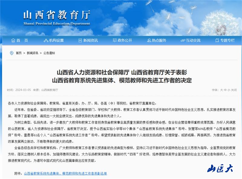 近日,山西省教育厅发布了2023年山西省教育系统先进集体、模范教师和先进工作者的表彰名单,我校公共卫生学院荣获“山西省教育系统先进集体”称号。
