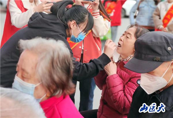 在医生的指导下,志愿者们为社区居民提供了免费的甲流抗原检测服务,帮助老人查看检测结果,并耐心为他们答疑解惑。同时,也为行动不便的老人提供上门检测,科普健康知识,做到了志愿服务的精准化,也得到社区居民的一致好评。