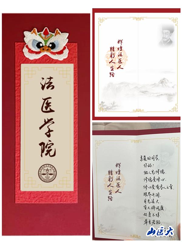 明德楼B座法医学院会议室,一张张喜庆的朱砂红底带有龙角卡通头像和院徽的定制贺卡,整齐地摆放在会议桌上,浅黄色贺卡内页左侧印有“精彩人生路 辉煌法医人”标语,右上角印有“法医学之父”宋慈头像,具有法医学专业特色的专属贺卡,经学院全体教师抒写新年寄语,将通过“击鼓传花”的方式送到同学们手中。