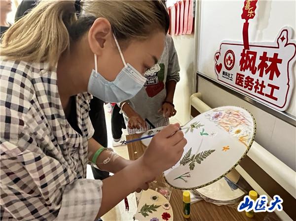 “尾巴一根钉,秋水两粒豆,有翅没有毛,有脚不会走。”这是趣味谜语闯关,大家纷纷发挥自己的智慧,开动脑筋集思广益,猜对者获得奖品。在巧手制作花灯环节,印着中秋元素的投影灯,在患者和家属的巧手下一块块拼凑起来,成为节日里的一道靓丽风景。大家还绘制了花样团扇,用水彩刻画、干花点缀,一把属于自己的中秋团扇便制作成功。