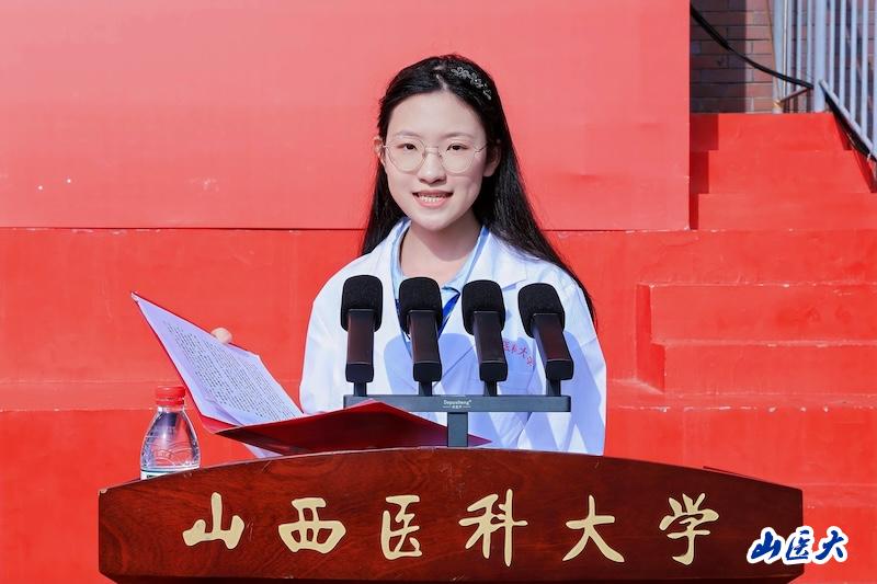 在此,我谨代表全体新生郑重承诺:一是要坚守初心,刻苦求知。我们会追求“医理博精”,尊重老师、认真听课,把每一门基础课学扎实,为未来的专业学习打下坚实根基。二是要锤炼医德,提升能力。我们会以“德能高邃”为目标,在学校“大思政-1345”“新医德”育人模式下,培养同理心、责任感,努力成长为“德才兼备”的医学生。三是要勇于探索,全面发展。我们会主动适应大学生活,学会管理时间,在学校“数智脑-1346”新医科人才培养模式下,学习专业知识,积极参与科研实践、社团活动,既要保持身心健康,也要拓宽国际视野,为未来参与医疗事业发展做好准备。