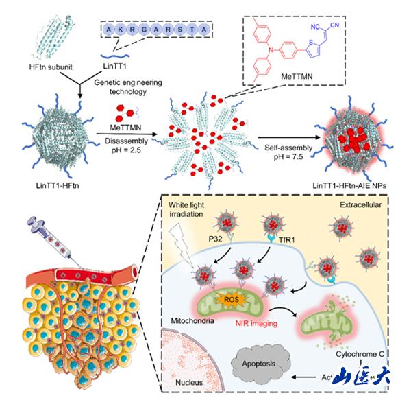LinTT1- HFtn-AIE NPs的构建及其靶向和治疗机制示意图