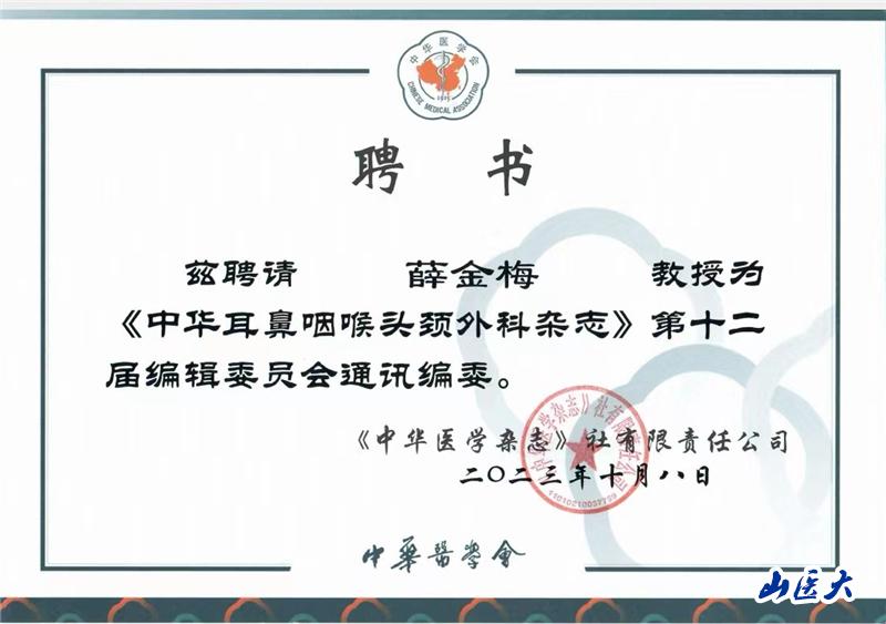 我校第二医院薛金梅教授获聘《中华耳鼻咽喉头颈外科杂志》第十二届编辑委员会通讯编委