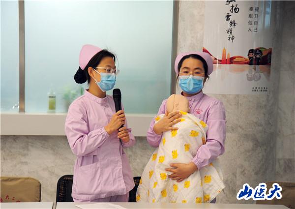 产科护士长刘芳和护理骨干王红媛现场讲解了哺乳的姿势、喂养的要点、新生儿正确的含接姿势,并现场指导各位准妈妈如何正确地母乳喂养。新生儿科护士张倩对此次主题内容“袋鼠式护理”进行解读,护士梁姣姣进行现场示范,希望通过袋鼠式护理的推广,让社会各界关注早产儿现象,降低早产儿病死率。