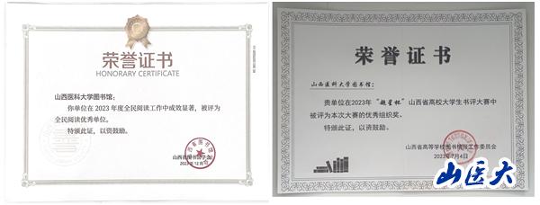 同时,我校图书馆还荣获了山西省高校图工委2023年首届“智信杯”山西省高校信息素养大赛“突出贡献奖”、第二届“大为杯”高校IP精英创新素养大赛 “优秀组织奖”。