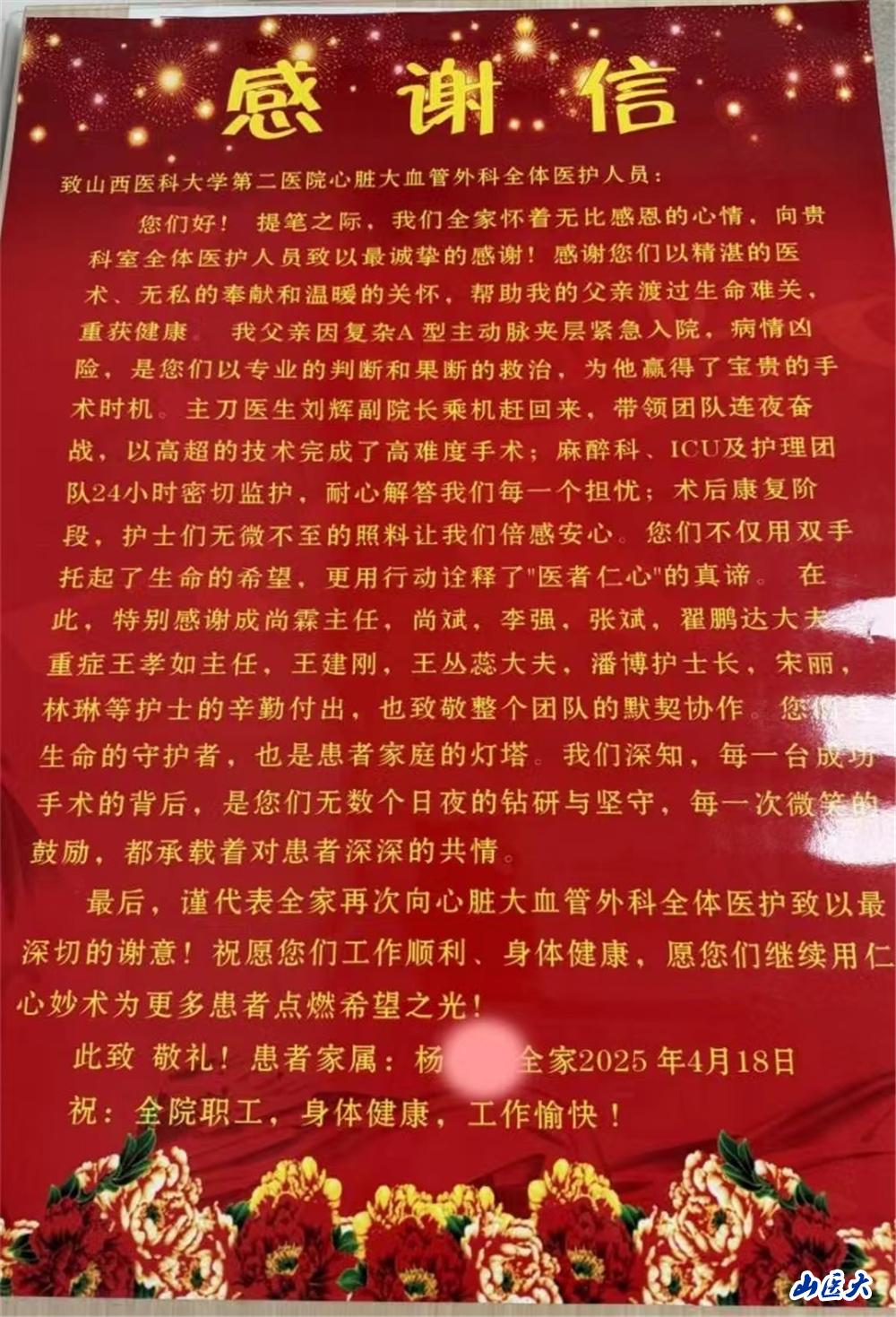 术后,家属紧握医护双手哽咽道。从术中麻醉科紧密配合,术后重症医学科王孝茹主任的循环支持,直至患者顺利拔管转入普通病房,这场“心脏拆弹”战役凝聚了30余名医护的心血。患者家属特别制作了题写“刀尖起舞拆‘血管炸弹’,仁心仁术续生命之光”的锦旗表达对医护人员的感谢之情,患者女儿更是向医护人员鞠躬致谢道:“父亲心脏里的每一针都缝着你们的医德医术,谢谢你们!”