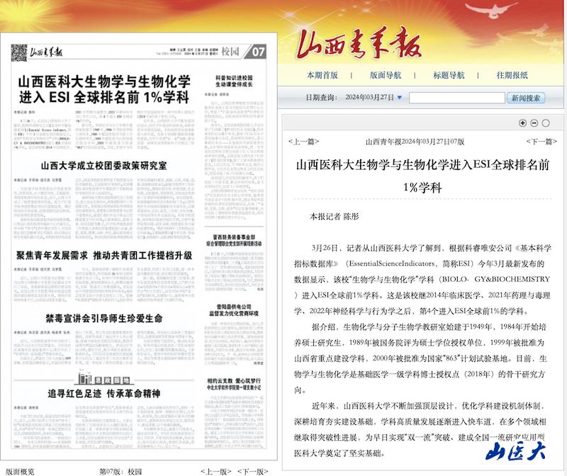 山西青年报 | 山西医科大生物学与生物化学进入ESI全球排名前1%学科