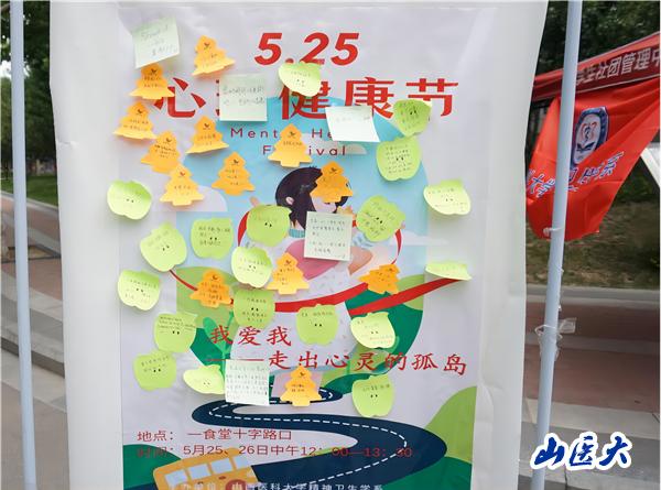 5月25日是大学生心理健康日,取自5.25的谐音“我爱我”,爱自己才能更好地爱他人,心理健康的第一条标准就是认识自我,接纳自我,能体验到自己存在的价值,乐观自信。5月25-26日中午,学校精神卫生学系联合第一医院精神卫生科在中都校区第一食堂外开展了“快乐YES,焦虑NO”主题活动,旨在让更多的同学走出心灵孤岛,倾诉心中块垒,学会接纳自我。