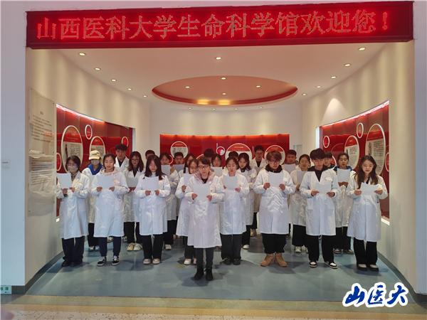 活动伊始,大家身穿白大褂,跟随讲解员的脚步重温了生命科学馆的六个展厅。一个个人体和器官标本,一幅幅展板,形象地展现了生命的孕育、人体的结构和功能、人类基因组计划、医学影像科技、未来医学等五个部分的内容,加深了同学们对医学知识的理解。当讲解员带领大家走入第六个展厅--“生命的永恒”时,同学们的心情变得有些沉重。这里展满了遗体捐献者的捐赠申请,着重介绍了两位遗体捐献者的感人事迹,其中一位是山西省首例捐献者巩象巽。他曾是山西大学教授,因突发脑溢血去世后把遗体捐献给了我校,标本费也不忘作为最后的党费转交党组织。在场的同学无不为他们的无私和伟大而动容。