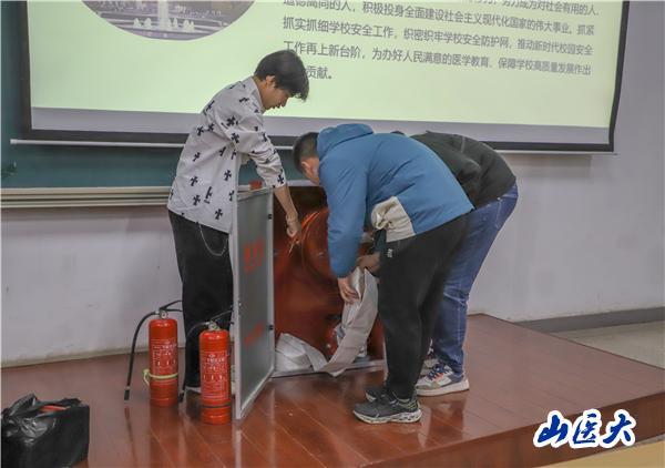 实践教学环节中,老师和同学们积极参与互动,近距离观察和学习消防设施的使用步骤和方法,掌握灭火器的“提、拔、按、压”、逃生面罩“开、拔、套、拉”的口诀,以及家中常备灭火器、手电、呼吸面罩等的安全知识。分组实操演练加深了同学们对消防器材的了解,熟悉了消防器材的使用,增强了同学们的火灾扑救技能,提高了同学们的应急处理能力。